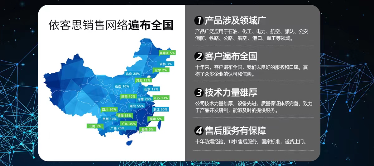 依客思防爆專注于防爆產(chǎn)品的研發(fā)、生產(chǎn)與銷售,主要產(chǎn)品有:防爆操作柱、BXCQ防爆靜電釋放儀、BZC系列防爆操作柱、不銹鋼現(xiàn)場操作箱、BXM(D)防爆照明(動力)配電箱、BXX防爆檢修箱、BXJ防爆接線箱、LED防爆燈、防爆管件、防爆風(fēng)機(jī)等產(chǎn)品,型號規(guī)格齊全,廣泛適用于煤炭、電力、醫(yī)藥、石油、化工、航空等領(lǐng)域。我公司產(chǎn)品質(zhì)量過硬,價格實惠,銷售范圍廣,且與各大型企業(yè)建立了良好的合作關(guān)系,同時還遠(yuǎn)銷中、東亞和北美等地區(qū),深受用戶喜愛與青睞。
